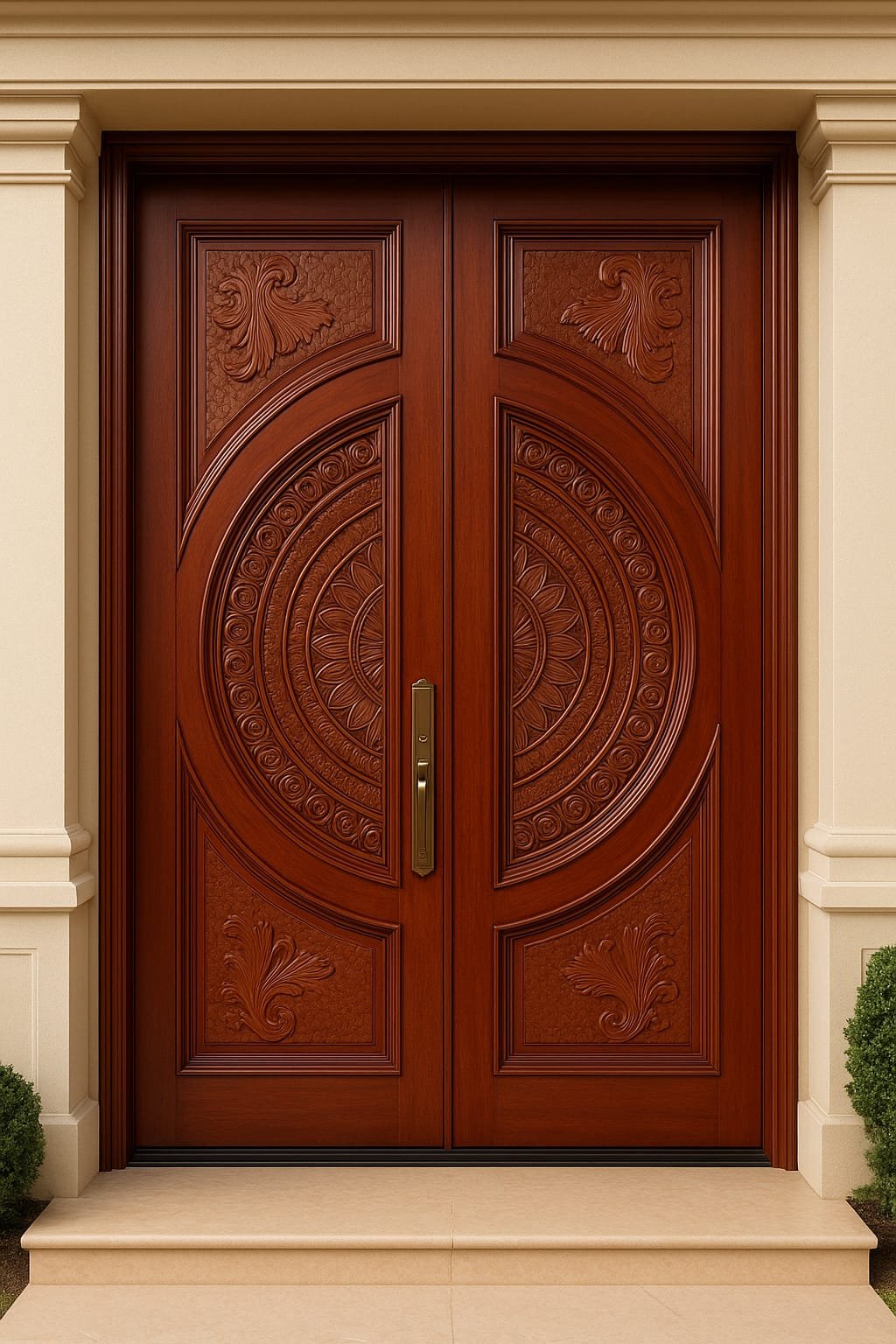 Constructed from premium solid hardwood, the door features a dual-panel design with intricate 3D carved patterns inspired by classic architecture. The rich mahogany-toned polish adds warmth and sophistication, creating a welcoming yet grand entrance for any residence.