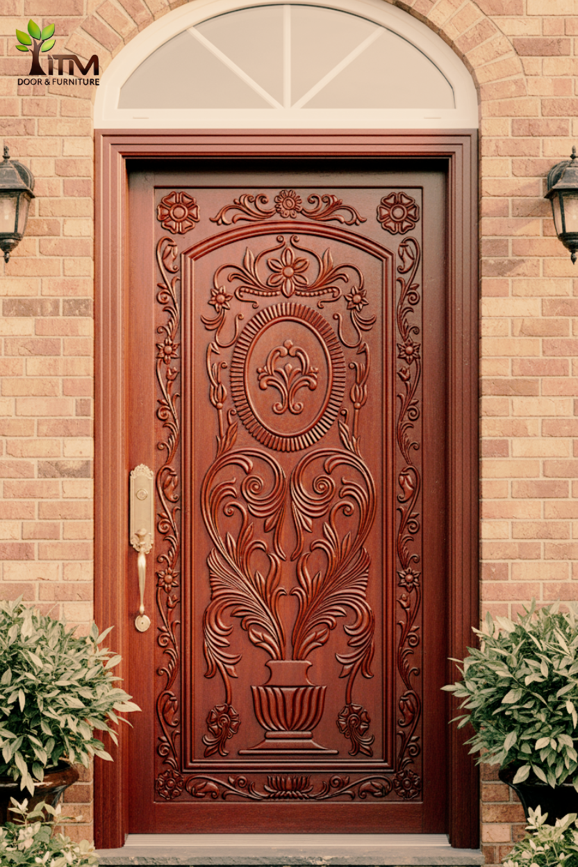 এর জটিল এবং সূক্ষ্ম কারুকাজগুলো ঐতিহ্যবাহী ডিজাইনের প্রতিচ্ছবি। দরজাটির উপরের অংশে থাকা আর্চ প্যানেল, ফ্লোরাল মেডালিয়ন (বৃত্তাকার ফুলের নকশা) এবং দুই পাশের রোপ-টুইস্ট (দড়ির মতো প্যাঁচানো) কলাম ডিজাইন একে একটি রাজকীয় ভাব দিয়েছে। নিচের প্যানেলের সুবিন্যস্ত জ্যামিতিক নকশা এর সৌন্দর্যকে আরও বাড়িয়ে তুলেছে।