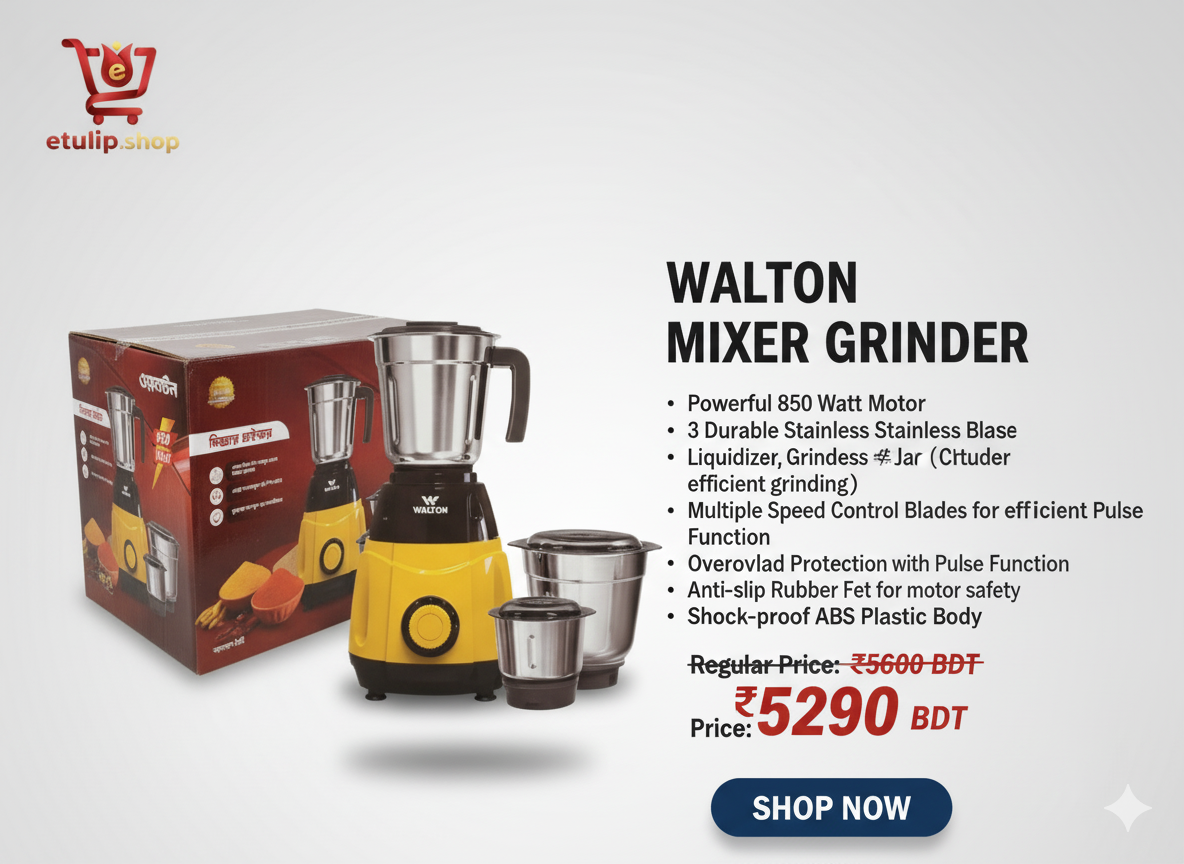 • Powerful 850 Watt Motor: এই মিক্সার গ্রাইন্ডারটি ৮৫০ ওয়াটের শক্তিশালী মোটর দিয়ে তৈরি, যা দ্রুত এবং কার্যকরভাবে যেকোনো কিছু মিশ্রিত করতে বা গুঁড়ো করতে সক্ষম।