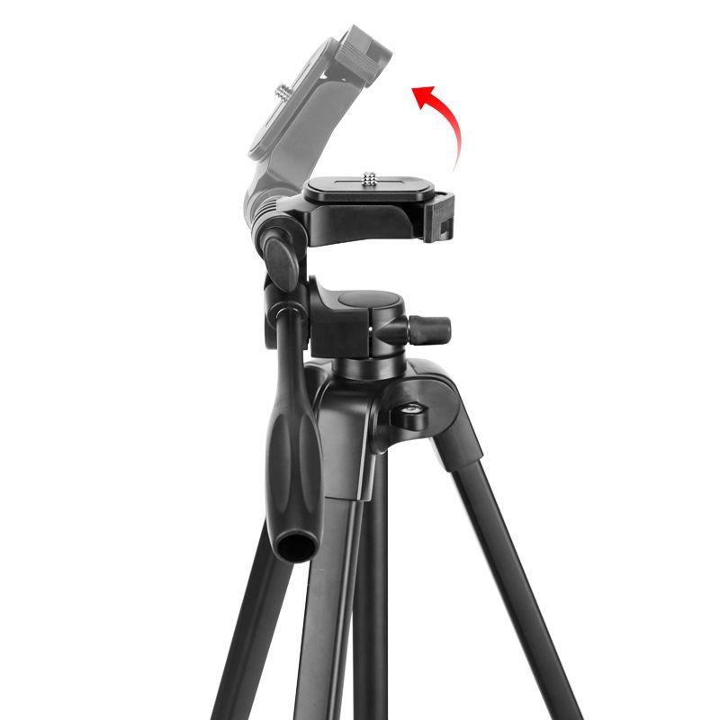 মাথা (Head): ট্রাইপডের উপরের অংশে একটি প্যান ও টিল্ট হেড রয়েছে, যা সংযুক্ত হ্যান্ডেলের সাহায্যে ক্যামেরা বা মোবাইলের দিক ও কোণ সহজে পরিবর্তন করার সুবিধা দেয়।
