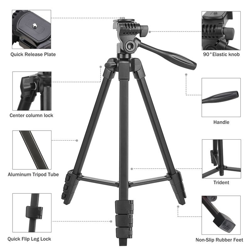 - গঠন: ট্রাইপডটি হালকা এবং টেকসই উপাদান (সম্ভবত অ্যালুমিনিয়াম বা প্লাস্টিকের সংমিশ্রণ) দিয়ে তৈরি, যা সহজে বহনযোগ্যতা নিশ্চিত করে। এর পা বা লেগগুলি একাধিক সেকশনে বিভক্ত, যা ব্যবহারকারীকে উচ্চতা প্রয়োজন অনুযায়ী বাড়ানো বা কমানোর সুবিধা দেয়।